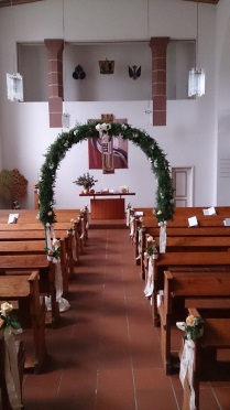 - Kirchenschmuck für die Stühle des Brautpaars, die Sitzreihen, den Altar, den Eingangsbereich innen und außen